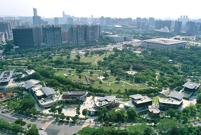 项目从差异化“非标”切入,结合毗邻东莞南城商务区唯一的大型公共绿地——中心公园的环境特色,打造城央封面地带的“公园式商业”。