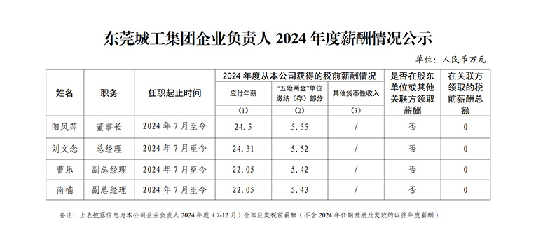 东莞城工集团企业负责人2024年度薪酬情况公示