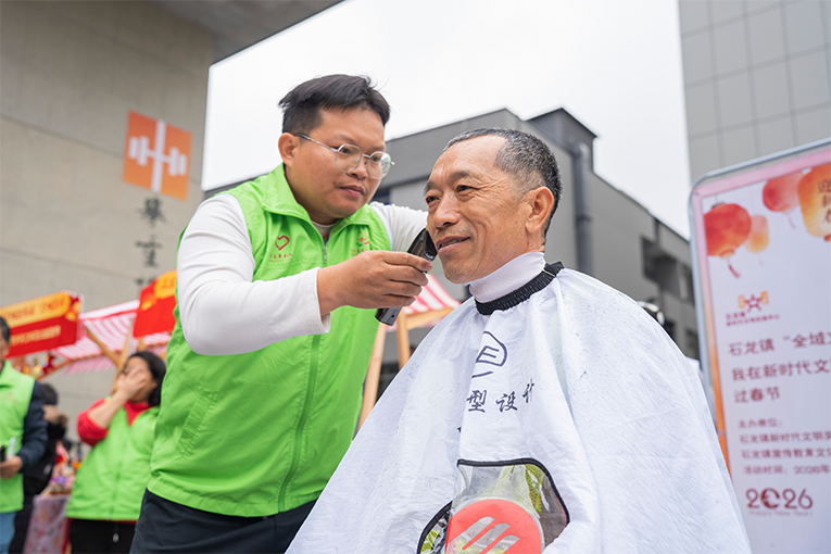 活动现场,书法家现场挥毫,墨香中传递祝福;义剪服务让工友们精神焕发迎新春;一份份热腾腾的特色餐食,暖胃更暖心。这些细节正是“和美宜居”理念的生动诠释——让每一位城市建设者都能感受到城市的温度。而最具特色的环节,莫过于用镜头为工友定格奋斗瞬间与团聚时刻。