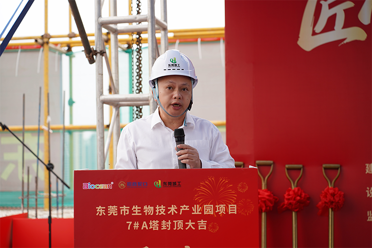 当天上午,松湖药港二期项目7号楼A塔封顶仪式在工地现场举行。东莞市生物技术产业发展有限公司董事长宋涛,东实集团党委委员、副总裁刘旸发,东莞市生技置业有限公司董事长黎颖杰,东莞城工集团董事长阳凤萍,以及业主单位、监理单位、施工单位等领导出席仪式。