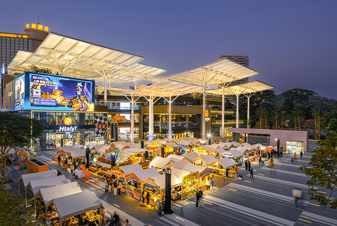 项目位于东莞市民服务中心北侧,计容建筑面积约3.53万平方米,于2022年9月动工,2024年9月30日正式开业运营,是东莞首个立体公园式购物中心C Park。项目最为突出的技术特点是屋顶雨棚膜结构系统,采用高度35米、超过2000吨钢结构、共计11块弧形飘蓬,并安装高效能控制透光、吸热的PTFE膜材,塑造出一个具有岭南风情的半室外城市公园,着力打造东莞市新的文化商业标杆。